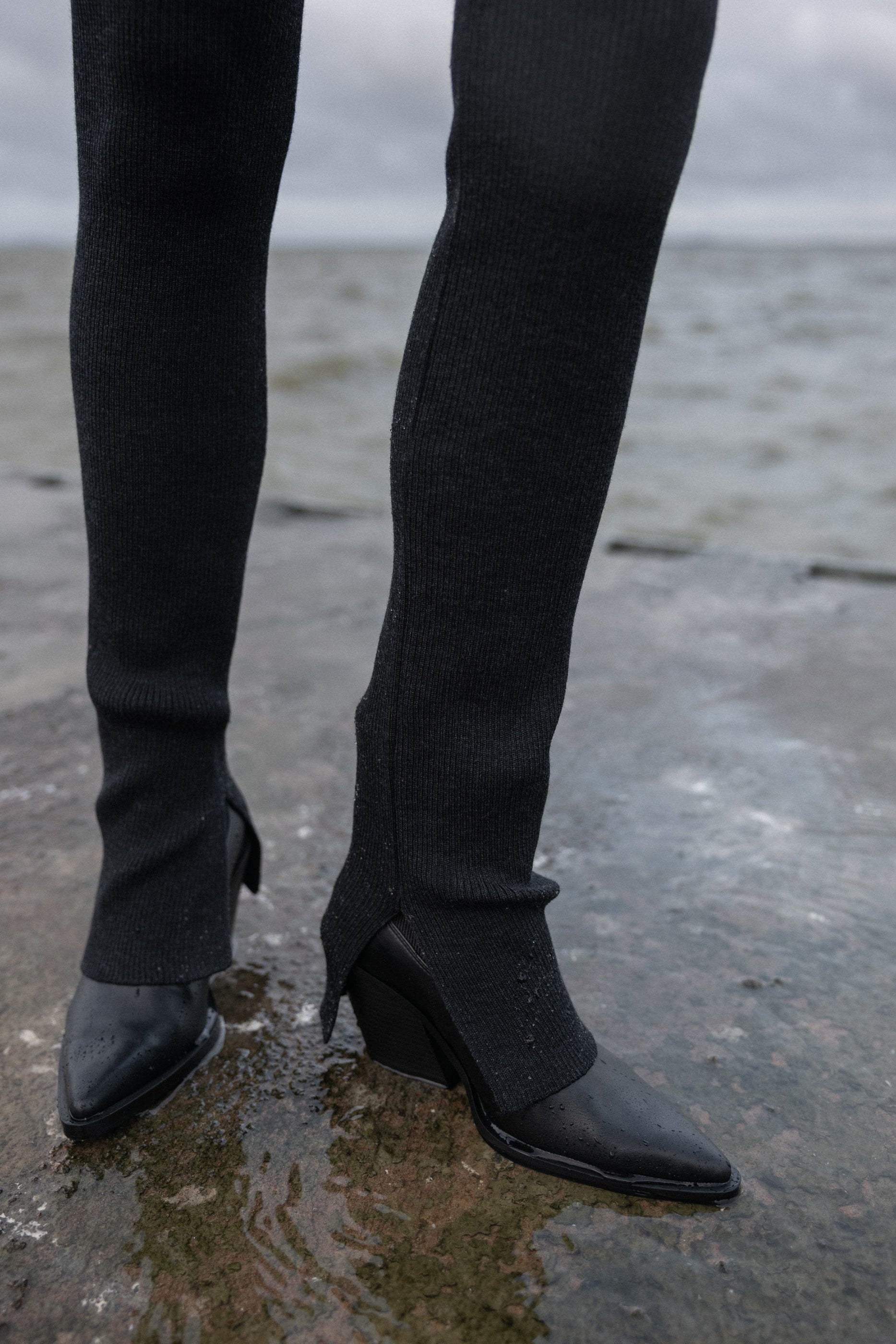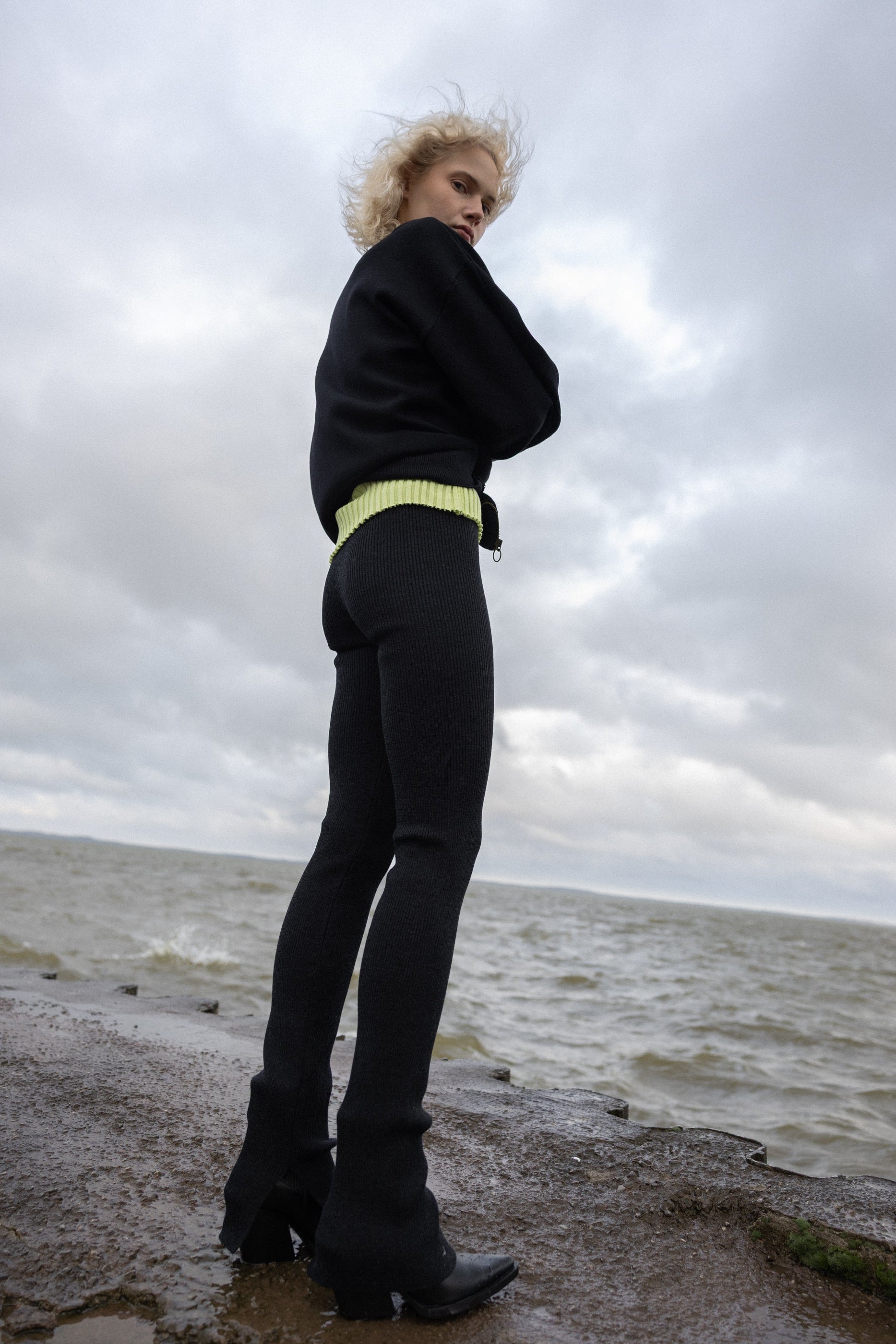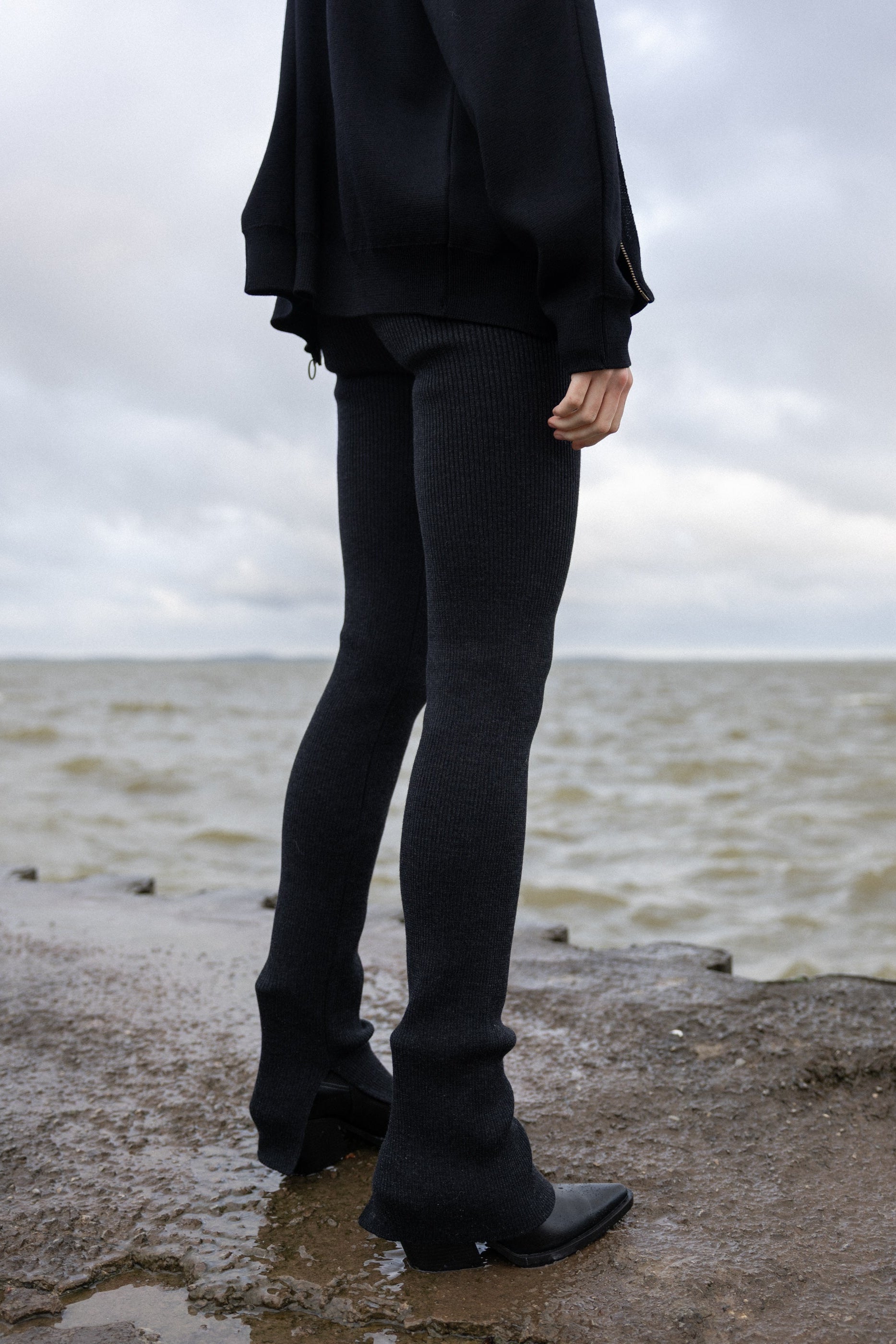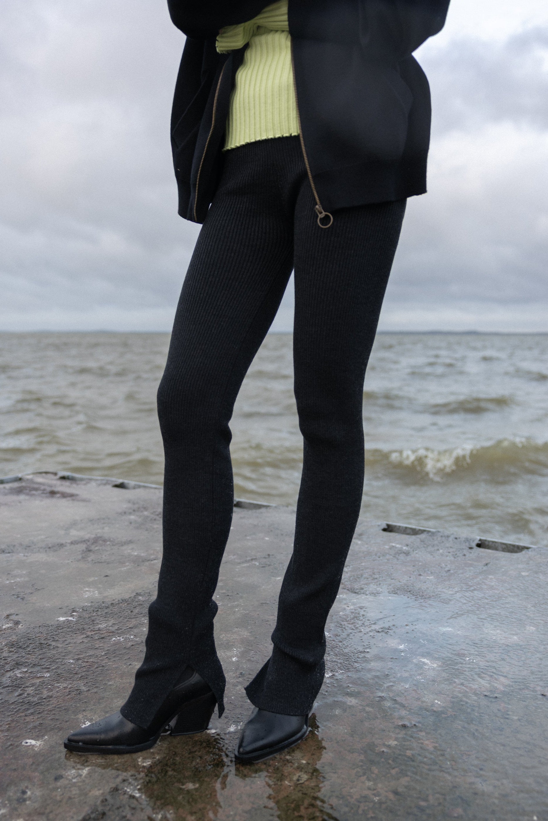 They are rib-knitted in a slip-on style with split hems. These leggings sit on the waist with an adjustable elastic band, ensuring a personalized fit. Yes, just like in children's clothes! It worked great for our clients. We tried them on a bunch of our friends with different body shapes and sizes - they all agreed the fit was just perfect to adapt even during pregnancy! Wear them paired with your favorite shirts, blazers, or oversized sweaters.