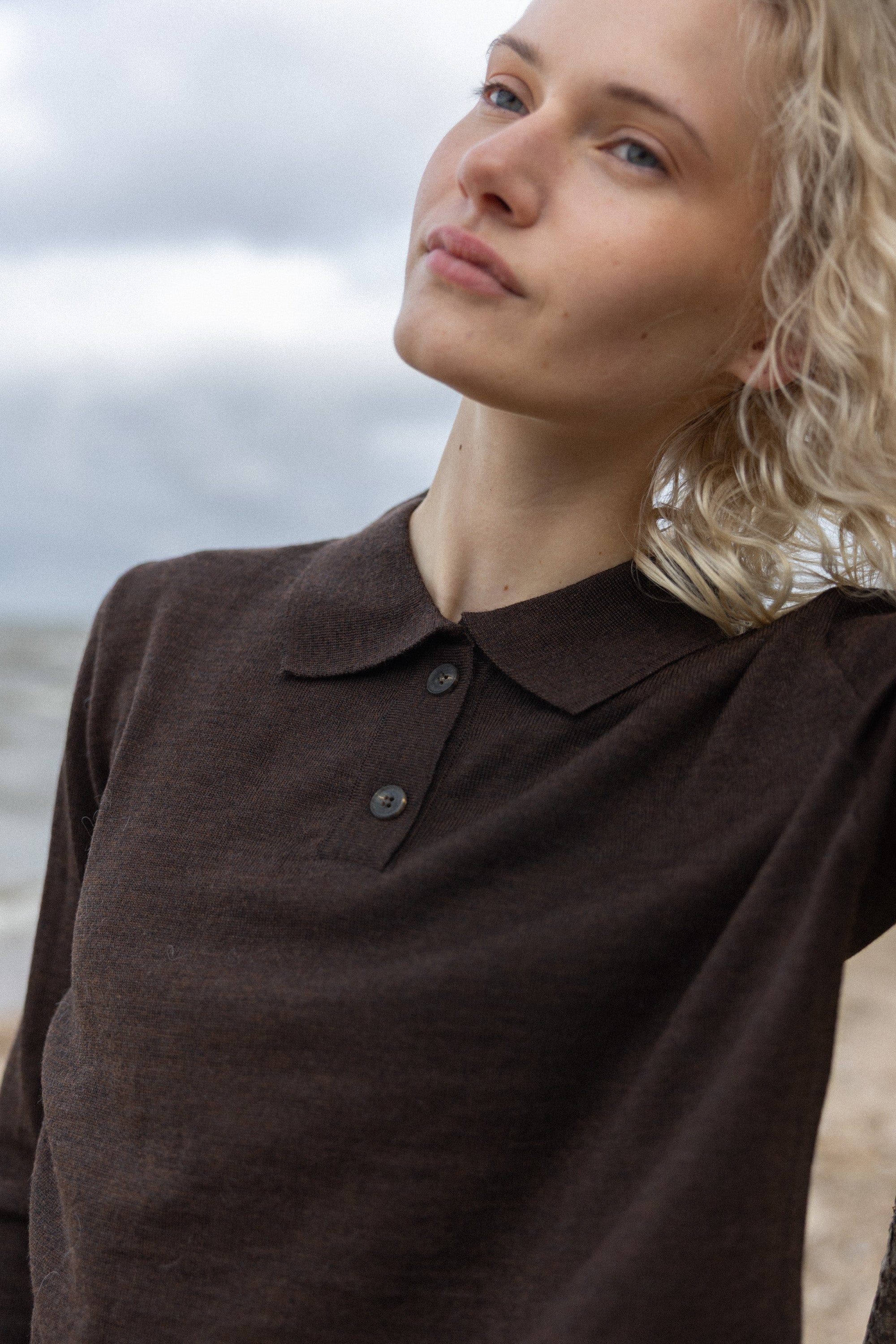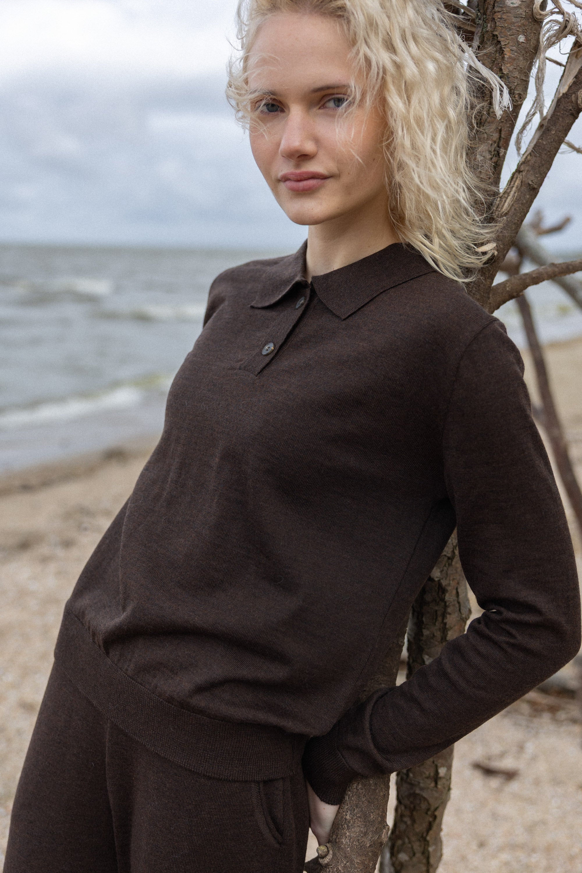 Galante polo top redefines modern elegance through simplicity. It’s designed in a relaxed fit with long sleeves and a classic polo collar.