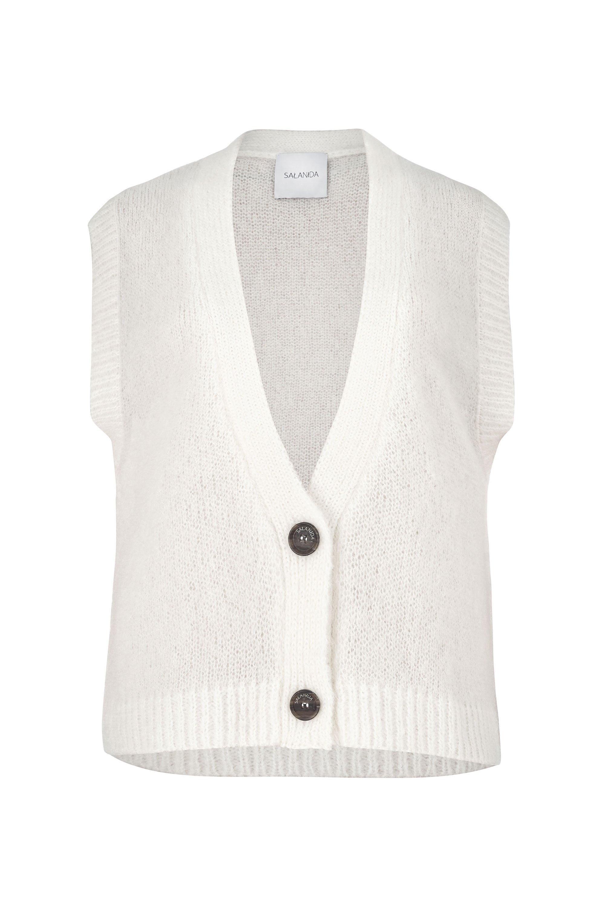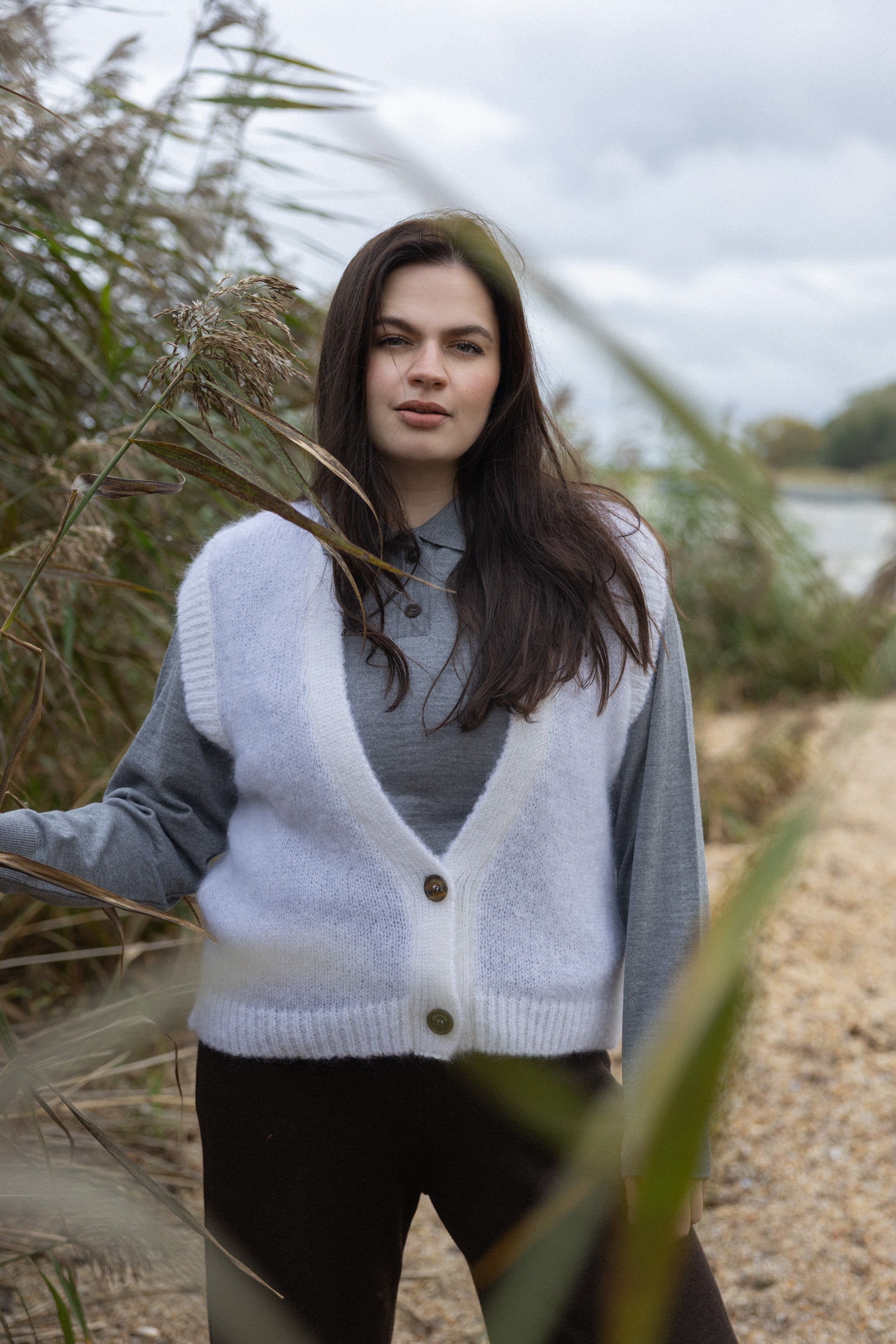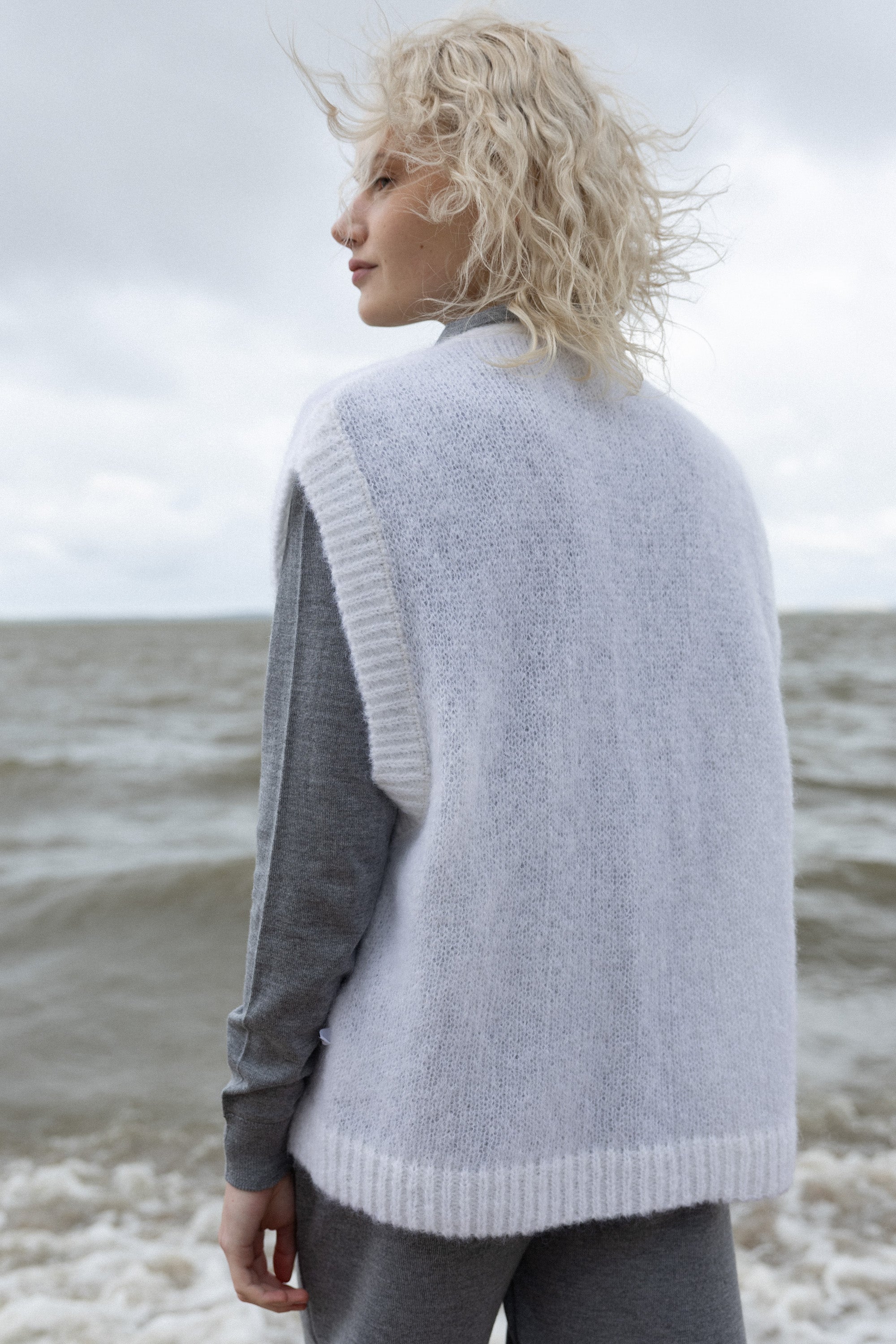 Melody vest is a versatile piece that transcends seasons and trends. Spun from kid mohair, it is as soft as a cloud. It comes in a relaxed One Size silhouette, finished with signature logo buttons. Layer it over tops, tees, and shirts.