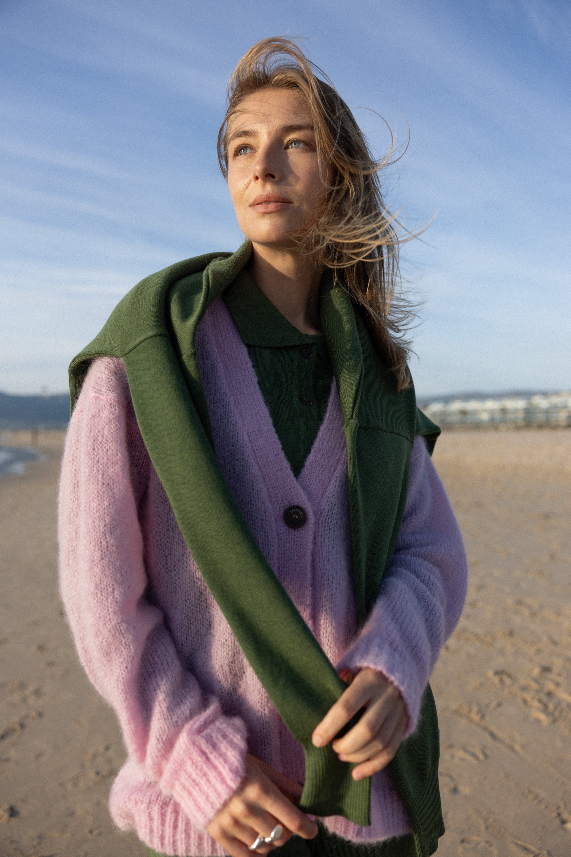 Crafted from featherlight kid mohair, it’s designed in a relaxed silhouette with dropped shoulders and a V-neckline, finished with our signature logo buttons for a refined touch.